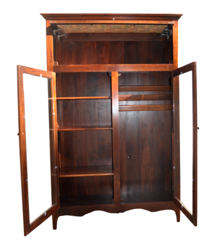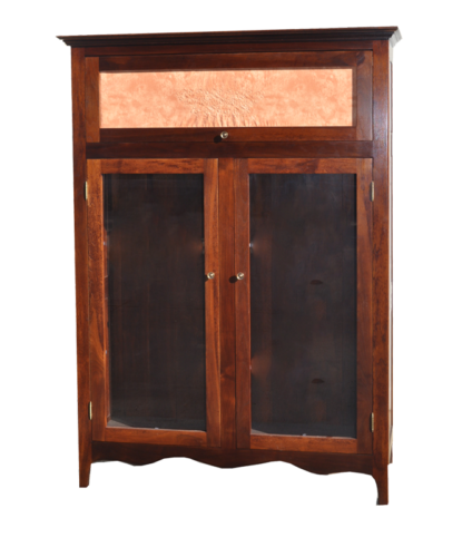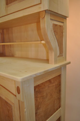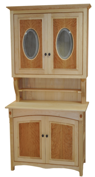 This custom designed Country Hutch is built from maple, cherry, curly cherry with walnut as an accent.  The raised panels are book matched curly cherry laminated onto maple.   Beveled oval glass highlights the doors on the upper section.  Inlaid cherry ovals and antique brass oval knobs decorate the lower section.  Hand cut mortise and tenon joinery strengthen this piece while hand carved lamb’s tongue soften the chamfered front edges.  Overall dimensions are 84” tall x 41” wide x 21” deep.