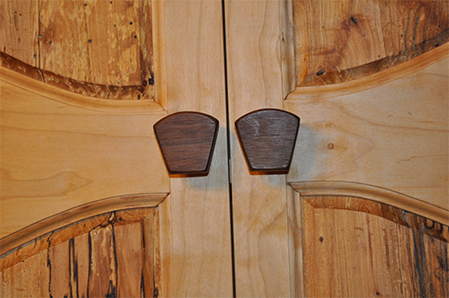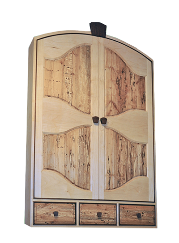 Pictured is a custom designed Wall Hung Cabinet made of maple, spalted maple and walnut. The curve of the rails and panels highlight the curved arched top. A walnut keystone is mimicked in the custom knobs. The dimensions are 53”tall x 34”wide x 7”deep.