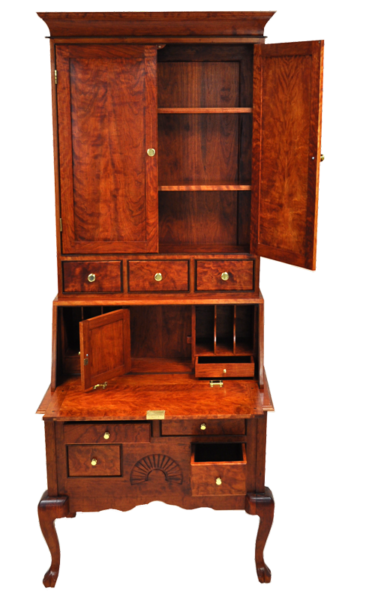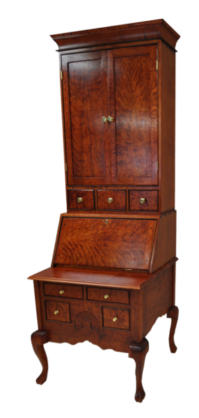 Queen Anne drop front secretary is built from curly cherry and cherry with walnut as an accent.  Ash is used as the secondary wood.  The hand carved fan highlights the lower section while book matched curly cherry panels highlight the middle and upper sections.  Dovetailed joinery is used on the case pieces and all drawers.  Two hidden compartments are utilized to store valuable documents.  Overall dimensions are 36” wide x 22” deep x 87” tall.
