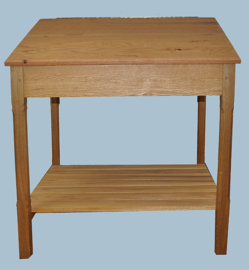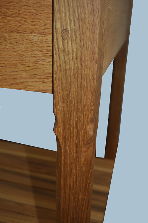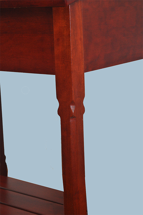 Although this merchant’s desk is modeled after an antique one, mine has several enhancements. A shelf installed at the base strengthens the legs and gives the user a place to rest his foot. The mortise and tenon joints on the original failed due to the size of the tenon. Therefore, I chose to install double tenons with the top tenon fixed while the bottom tenon floats. The inside of the desk is more elaborate with drawers and doors as well as pigeon holes. The hidden compartment plan has three hidden compartments that allow the merchant to hide valuables. The lid has a built-in way of propping open to ease access. The legs are adorned with hand carved lamb’s tongues.